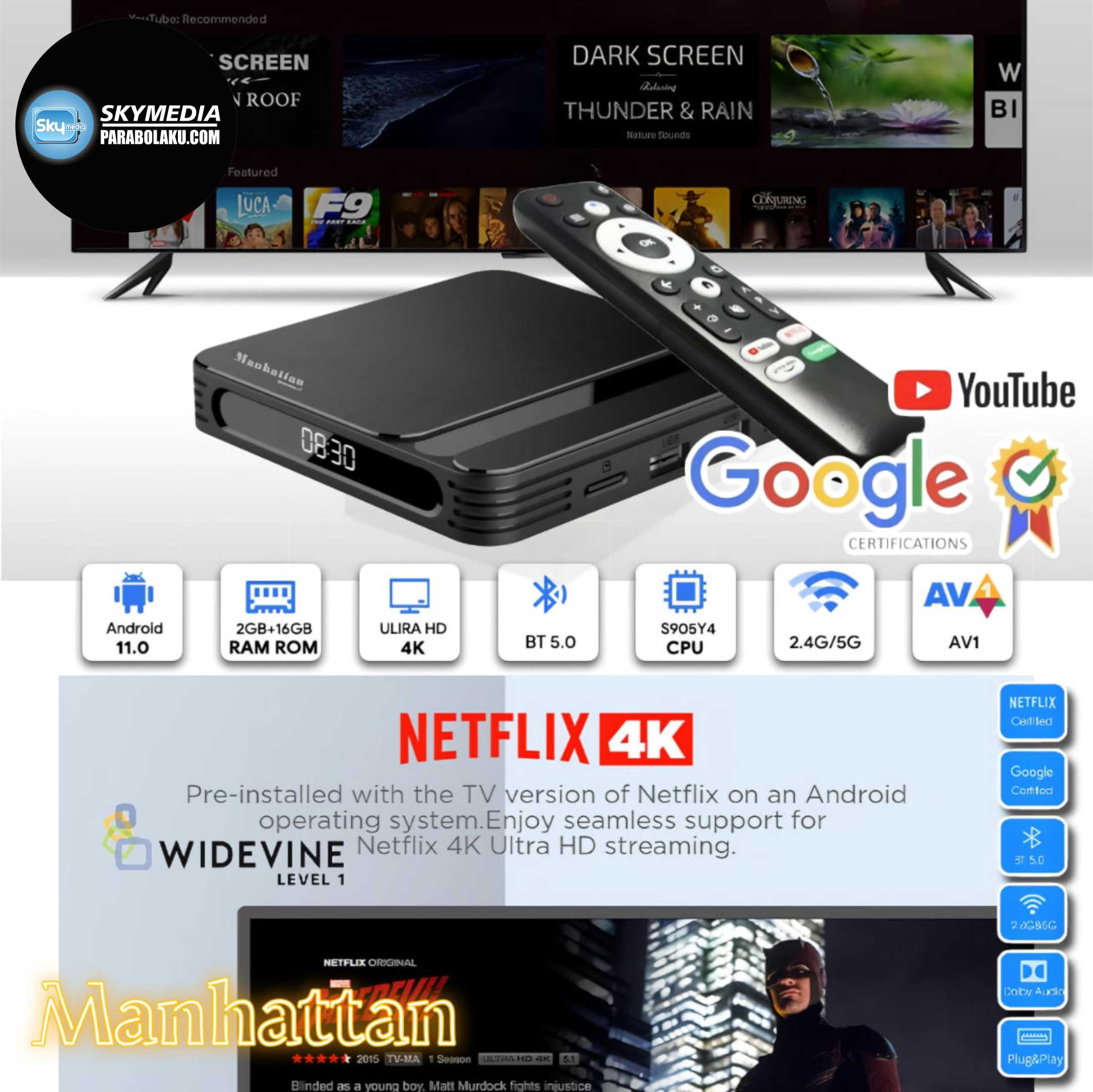 Didesain khusus untuk penikmat Netflix, YouTube, Prime Video, Vidio, Disney+ Hotstar, dan aplikasi streaming lainnya, Manhattan Android Box menghadirkan kualitas hiburan tanpa batas. Resmi tersedia di Skymedia Parabolaku !