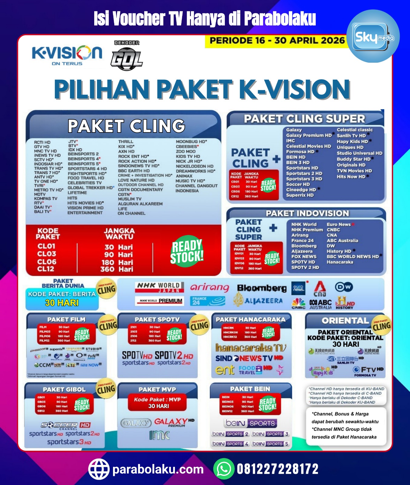 *Harga Hubungi CS ParabolakuPasti Lebih Mudah untuk Isi Voucher TV di Parabolaku Segera Isi Voucher nex PARABOLA di Parabolaku, untuk menikmati Siaran Favorit bersama keluarga Berlangganan Paket Nex Parabola akan bisa menikmati LIVE Sepakbola Liga Inggris, Liga 1 dan 2 Indonesia, Liga Italia, Carabao Cup, FA Cup, Badminton BWF, Voli dan Channel Hiburan Dunia dan Channel Nasional lengkap… selengkapnya